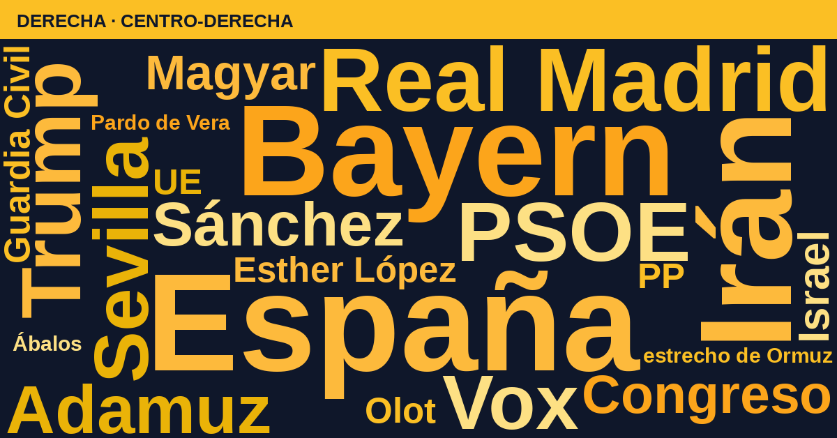 El bloque de la derecha presenta una agenda más diversificada: junto a la crisis en Irán (11%) y la figura de Trump (10%), destaca una inusual presencia deportiva con Bayern y Real Madrid empatados al 11%, probablemente por una jornada de Champions. El seguimiento del PSOE (10%) y la crónica local de Adamuz y Sevilla (8% cada uno) completan un mapa de titulares menos centrado en la confrontación política directa.