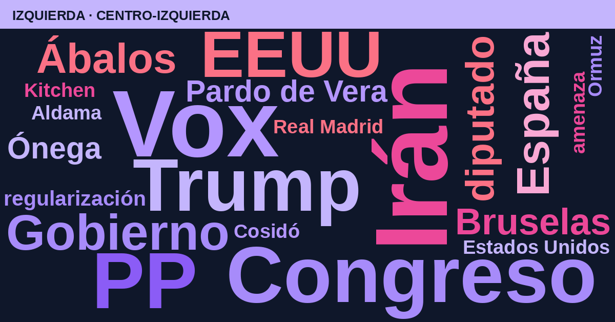 La izquierda eleva Irán al 17%, el peso más alto de cualquier bloque, y sitúa Vox (15%) y Congreso (12%) como los otros dos ejes dominantes. El PP (12%) recibe una atención similar al Congreso, lo que apunta a una semana de actividad parlamentaria intensa. Ábalos (6%) mantiene presencia en la agenda como hilo de seguimiento judicial.