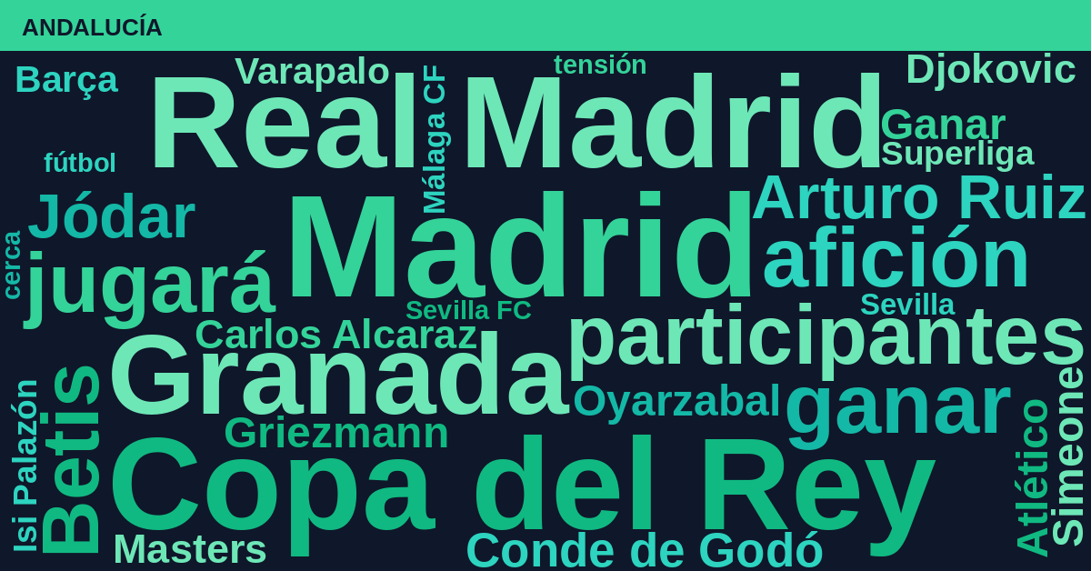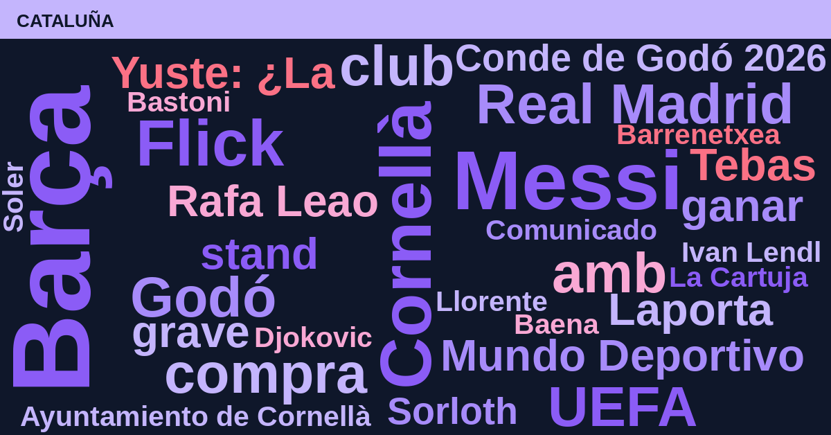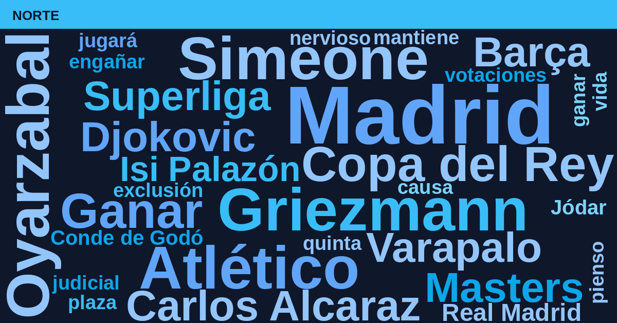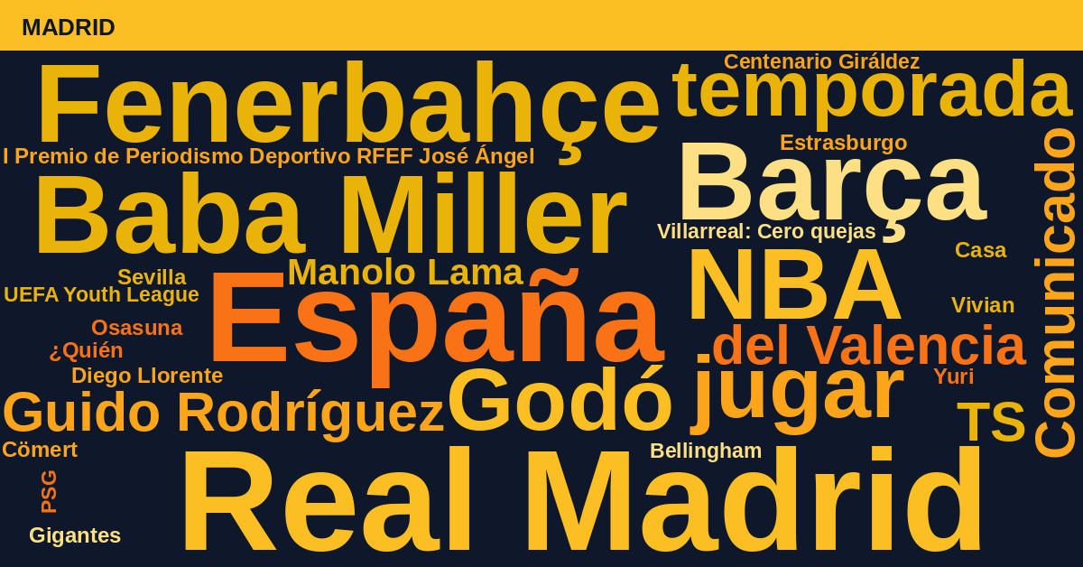 La agenda deportiva global hoy está marcada por la presencia masiva de Madrid (23%) y Barça (18%), impulsados por la actualidad judicial de LaLiga y los preparativos de la Copa del Rey (10%). La ausencia de Carlos Alcaraz en el torneo de la capital también genera un volumen notable de conversación bajo el término Madrid.