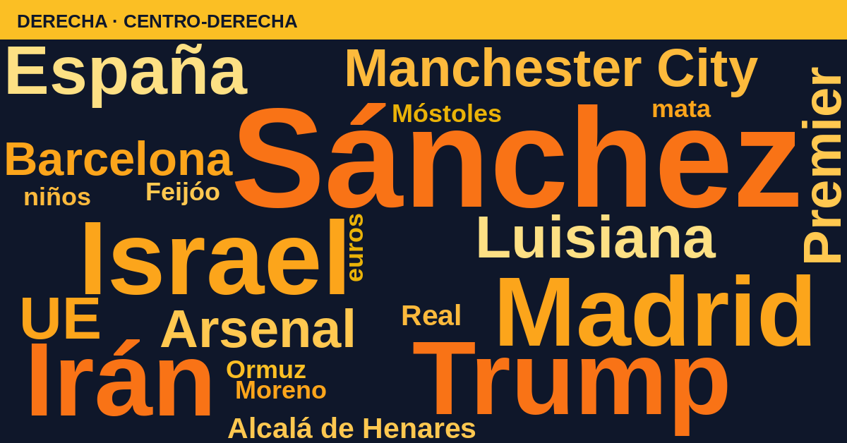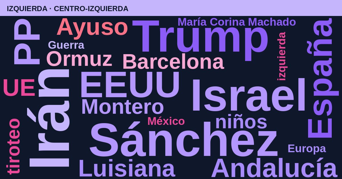 En la izquierda, la prioridad absoluta es la crisis en Irán y la escalada bélica en el estrecho de Ormuz, siguiendo de cerca los movimientos tácticos de Trump y la situación humanitaria en Israel. Se observa un mayor interés por la fiscalización al PP y la política regional en Andalucía, manteniendo a Sánchez en una frecuencia notable pero menos dominante que en el bloque opuesto.