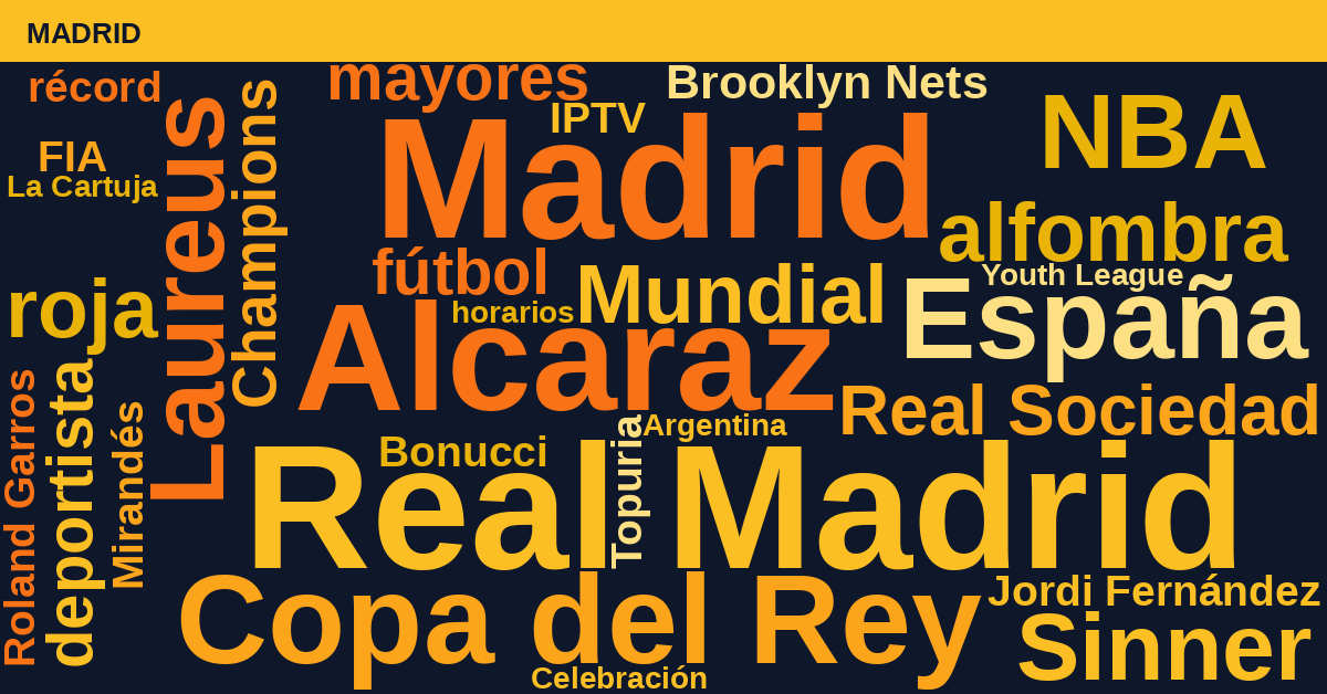 Madrid22%Real Madrid16%Alcaraz14%Laureus12%NBA8%Real Sociedad7%Betis7%IPTV6%Atlético6%