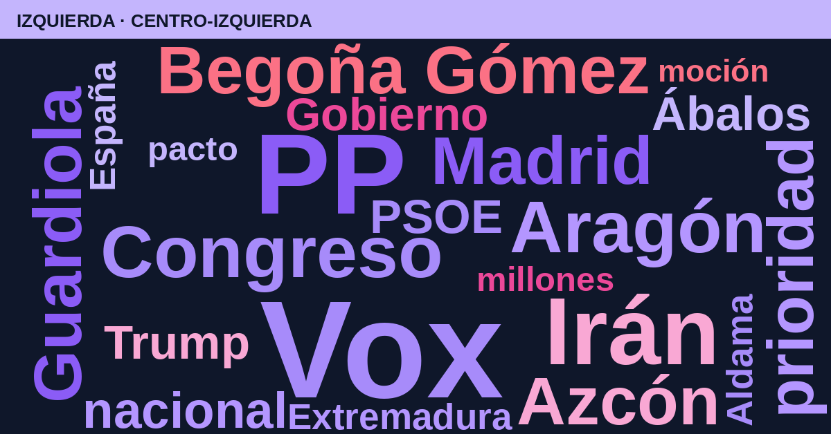 En el bloque de la izquierda, el protagonismo de Vox es absoluto tras consolidar su entrada en el ejecutivo de Azcón. La atención se divide entre la repercusión de este pacto autonómico, la defensa que Guardiola hace de su propio giro político y la grave situación internacional en Irán, además de las novedades judiciales sobre Begoña Gómez.