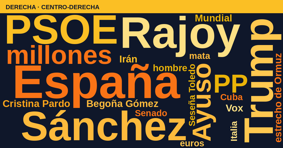 El bloque de derecha centra su atención en una clave nacional, con España como eje central de la conversación. La declaración de Rajoy se analiza bajo el prisma de la confrontación con el PSOE y Sánchez, mientras que temas como la gestión de Ayuso y las novedades sobre Begoña Gómez mantienen un peso específico alto.