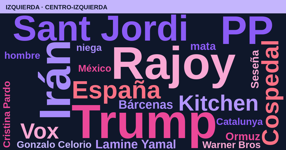 En la izquierda, la figura de Donald Trump y la tensión internacional con Irán dominan la narrativa, aunque la implicación de la cúpula del PP en la trama Kitchen y la declaración de Rajoy ocupan gran parte del espacio. La festividad de Sant Jordi encuentra aquí un mayor eco que en el bloque opuesto, junto a referencias a Cospedal y Lamine Yamal.