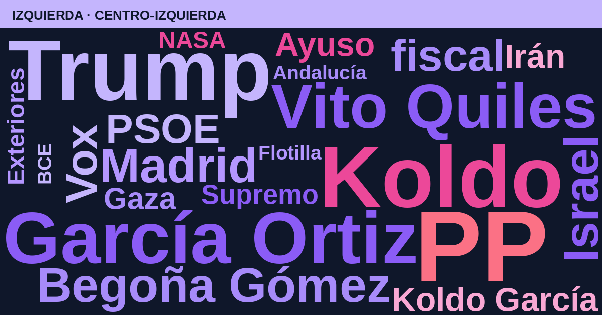 La izquierda reparte su peso entre la fiscalización al PP y el seguimiento de la trama Koldo, aunque con una frecuencia significativamente menor. Destaca un mayor interés por la actualidad internacional (Trump, Israel) y la defensa de figuras institucionales frente a ataques mediáticos, personificados en el fiscal general García Ortiz y la polémica con Vito Quiles.